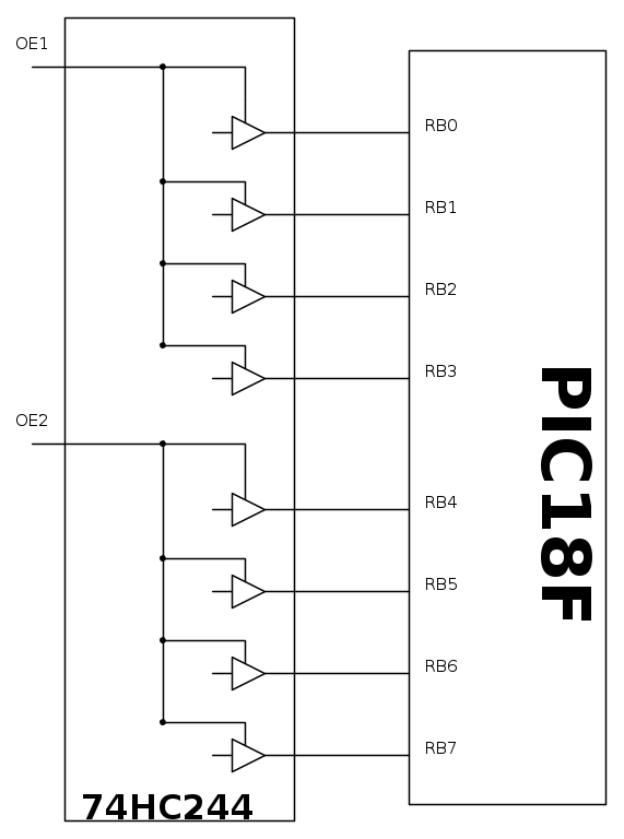 - Eseguo 10 operazioni di xor fra i bytes dgli stati precedenti con i corrispondenti degli stati attuali. Se il bit di risultato è 1 vuol dire che il corrispondente ingresso ha commutato, mandato in and con l' ingresso avrò un 1 solo se la commutazione è stata da 0 a 1, ma eseguo tale operazione solo se il bit che mi indica una commutazione è a zero. In questo modo tengo traccia delle commutazioni fino a quando non la servirò. A quel punto, da software dopo averla servita, azzererò il bit che mi indica la commutazione.