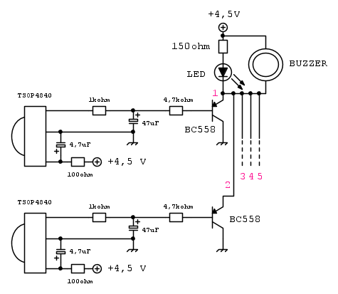 Se per i 5 circuiti ti basta un led e un buzzer puoi costruirli identici fino al transistor BC558 poi collegarli in parallelo (sugli emettitori):