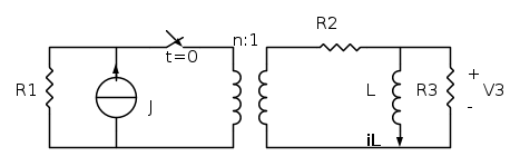 J=2 A, R1=100 ohm, R2=R3= 20 ohm, L=100 mH, n=4.