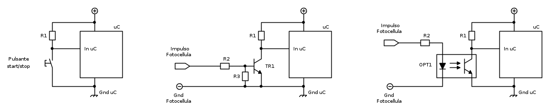 Per me la soluzione migliore è quella a destra, oltre a permettere di ottenere lo start/stop da un impulso proveniente dalla fotocellula permette di mantenere isolato il cronometro evitando il danneggiamento del circuito interno se qualcosa dovesse andare storto.