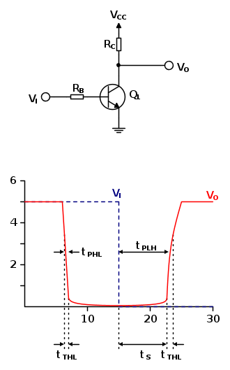 sostanziale differenza: in tal caso la tensione d'uscita passa dallo stato basso a quello alto dopo un tempo finito, durante il quale il BJT rimane ancora nello stato di saturazione, per un intervallo di tempo finito non nullo dopo che il segnale di ingresso è ritornato al livello basso. Questo tempo caratteristico (in figura indicato con
