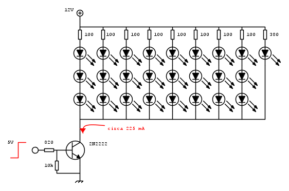 Bubino ha scritto:e di collegare i LED in parallelo con il positivo dell'alimentazione esterna. Ciò mi porta ad una semplificazione del circuito, che è ottima secondo me... Ma, è fattibile?