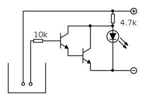 Dovrebbe funzionare anche con liquidi poco conduttori e forse anche con un solo transistor ma è tutto da verificare.