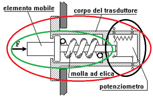 Quello verde identifica il trasduttore forza-spostamento, mentre quello nero il trasduttore spostamento-tensione. In particolare, il "cerchio" verde costituisce il sensore, essendo a diretto contatto con il misurando, dell' intero sistema di trasduzione forza-tensione (cerchiato in rosso).