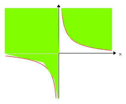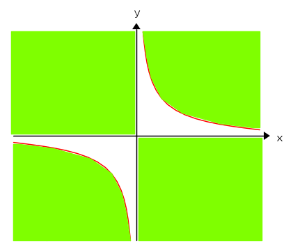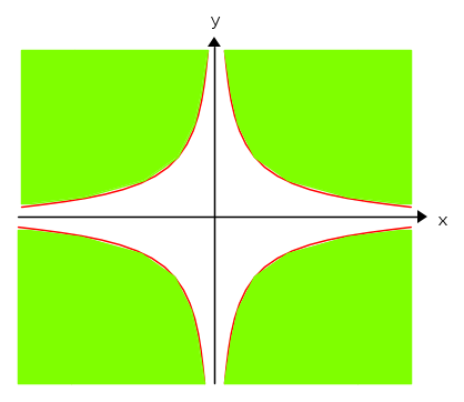 se x e y sono discordi, avremo che il primo membro della disequazione è negativo, e quindi sicuramente minore di uno. Questo ti dice che il secondo e quarto quadrante appartengono alla soluzione. Se invece sono concordi, e quindi appartengono al primo e terzo quadrante, hai che la linea di confine è rappresentata dall'iperbole, che divide i quadranti in due parti, e per individuare la soluzione basta che scegli un punto in una delle parti e vedi se appartiene alla soluzione, es. nel primo quadrante: x=5 e y=5 abbiamo che 1/25 <=1 , quindi l'area al di sopra della parabola appartiene alla soluzione.
