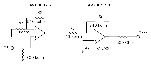 Innanzitutto ho provato a realizzare più stadi uguali, tutti Invertenti. Subito però mi sono accorto che non era conveniente perché, avendo nel primo stadio la R1 vincolata a 300kohm e la R2 che dev'essere inferiore a Rid/2 = 1Mohm non potevo ottenere un guadagno abbastanza alto e avrei dovuto usare tantissimi stadi.