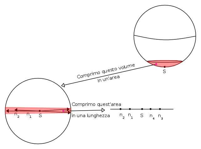 Questo fa si che il segmento sul quale avevo ristretto lo spazio sulla sfera (che era il diametro del cerchio ed una corda della sfera) sia in realtà una retta, ovviamente di lunghezza infinita, che definisce tutti i numeri reali.