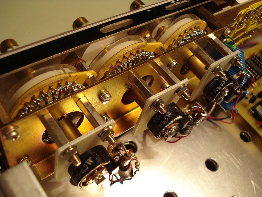 In origine erano dei normali commutatori a 26 posizioni, ho forato gli alberi e li ho resi coassiali con quelli dei potenziometri, si vede dalle manopole che hanno la testa in ottone che trasmette il moto ai potenziometri.