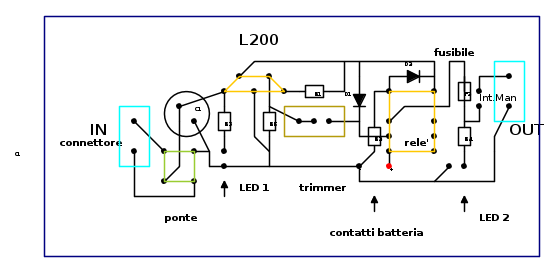 Oltre ad aggiungere i nomi dei componenti, ho aggiunto all'uscita una morsettiera, sostituito il trimmer con quello multigiro e modificato l'Int.Man., lo porto fuori come i led.