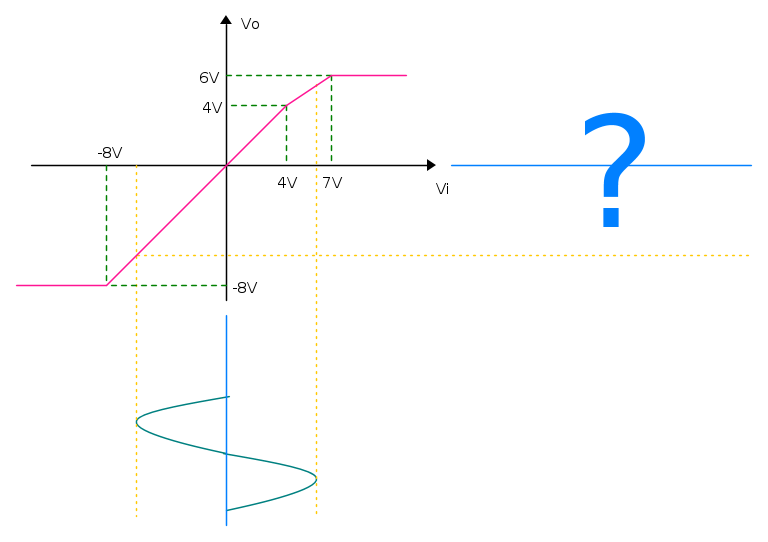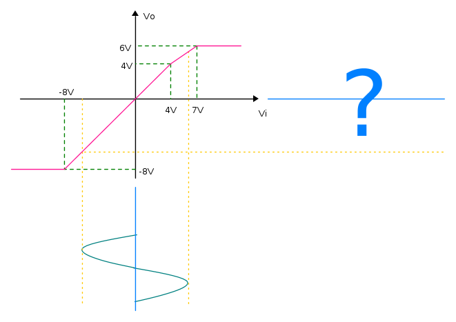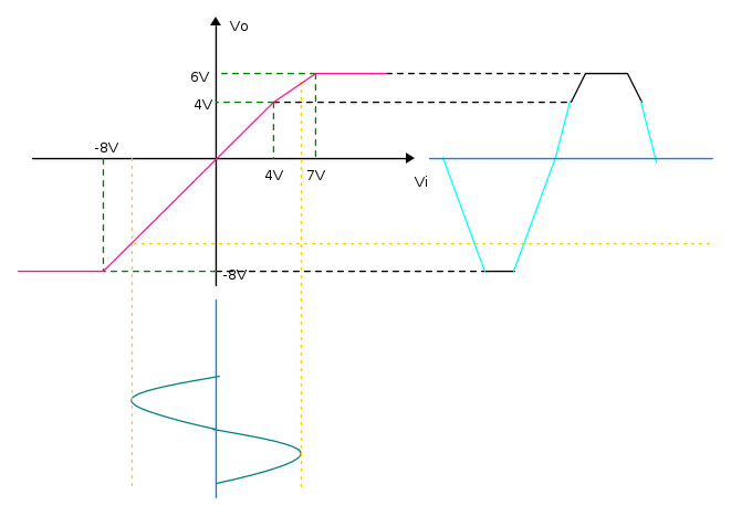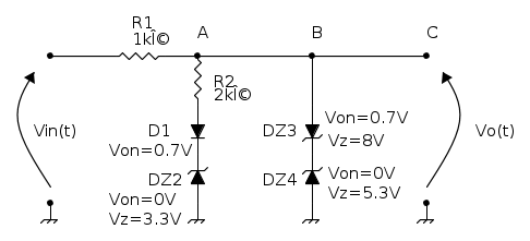 i) per -8V < Vin < 4V avremo che in entrambi i resistori non viene a circolare corrente a causa della soglia di +4 volt per l'innesco del primo ramo e della soglia di -8 volt del ramo destro