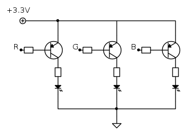 Allora, per il dimensionamento delle resistenze bisogna innanzitutto stabilire se vuoi usare PNP o PMOS. Con questi valori sarebbe meglio usare un PMOS, perché con un PNP ci staresti troppo stretto con la tensione disponibile per il LED blu (e per il verde, che in teoria dovrebbe essere quasi uguale), dato che dovresti tenere in conto la caduta causata dalla V_{CE-sat} \simeq 0.2 \mbox{V} del transistor.