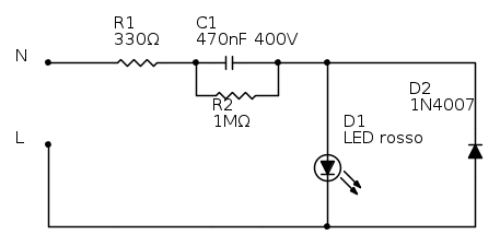 max1971 ha scritto:Per portare in sicurezza il LED ti riferisci a questo schema? Non mi fido a installarlo sulla rete senza il diodo il LED si brucerebbe....