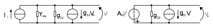 Grazie per la risposta e per il chiarimento...tornando a noi Vo/Is ..Vo è la caduta di potenziale su g22 che sarebbe Avol*V^(-)... Is invece è la corrente sull impedenza Yeq1 su cui cade la ddp V^(-) quindi per la legge di Ohm Is=V^(-)/Yeq1...e semplificando e facendo i calcoli ottengo il guadagno che ho chiamato A senza retroazione..è corretto?...poi non devo reazionarlo facendo. A/(1+beta*A) e infine trovo il guadagno in tensione moltiplicando il tutto per l impedenza di ingresso Yeq1