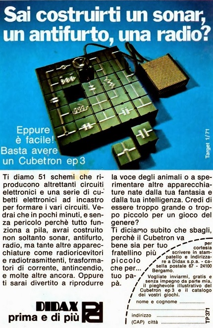 richiurci ha scritto:Era allegato a un kit per gli esperimenti, dei quadrotti magnetici facilissimi da usare anche se ovviamente un po' limitavano le possibilità di variare i circuiti.