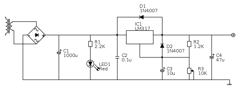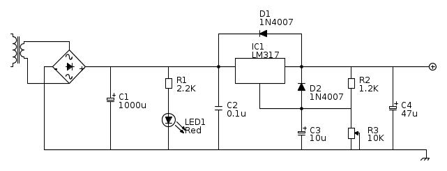 lostsheep ha scritto: Lo schema è pressoché quello postato in precedenza. a meno del LED e della relativa resistenza di limitazione che adesso ho messo a monte dell'LM317......