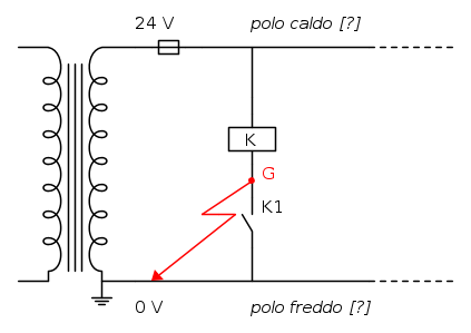 ...un (ed uno solo) guasto a terra nel punto G, energizza intempestivamente la bobina del contattore senza che nessuna protezione intervenga