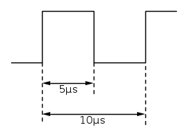 , supponendo un duty cycle del 50% avrei questa situazione idealeora per avere un'onda quadra che stia alta per un tempo sufficiente ho imposto che il tempo di salita sia un decimo del tempo per cui il segnale sta alto quindi