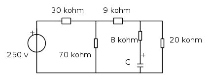 Salve a tutti, ho studiato la teoria riguardante i circuiti RC ma al momento degli esercizi sto riscontrando dei dubbi che possono sembrare banali. Ad esempio nel seguente circuito devo trovare la costante di tempo e la tensione ai capi del condensatore a regime. Se non ho capito male la tensione a regime dovrebbe essere uguale a quella del generatore... per quanto riguarda la costante di tempo tau=RC.... come trovo R?equivale alla resistenza equivalente di thevenin?