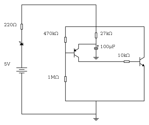 Il condensatore allora comincia a scaricarsi attraverso la resistenza da 3,9 M( l' unica via rimasta ) partendo da una tensione di 8,5 V con tendenza a zero V ,ma la scarica si fermerà quando la tensione sarà circa 3,9 V, perché allora la base del PNP comincerà a condurre e siamo come nello stato di accensione del circuito e da lì ricominciano i processi visti prima.