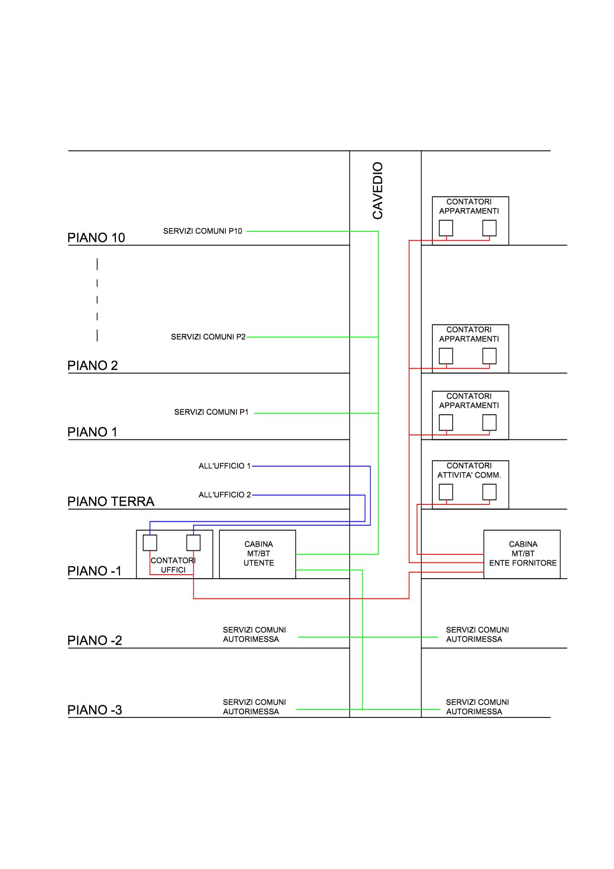 Mi baso sul disegno. La linea ENEL che alimenta i contatori uffici attraversa il cavedio e l'autorimessa. Le linee che alimentano i contatori degli appartamenti attraversano solo le parti comuni. Non si capisce se il cavedio sia comunicante con l'autorimessa, non credo, se lo fosse la prima cosa da fare è compartimentarlo rispetto all'autorimessa. Per quanto riguarda la linea ENEL transitante non ci sono tante soluzioni: