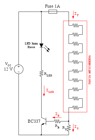 è una resistenza di sense che viene utilizzata per misurare la corrente che scorre sulle fasce. Questa resistenza va in serie alle fasce e quindi diminuisce la corrente che scorre in esse (e quindi la potenza dissipata da esse); quindi, deve essere più piccola possibile. Però, come succede spesso in elettronica, abbiamo anche la richiesta contraria: questa resistenza non deve essere troppo piccola perché altrimenti la tensione ai suoi capi non è sufficiente ad "accendere" il BJT. Infatti, per funzionare, il BJT ha bisogno di una tensione Base-Emettitore dalle parti di 0.6-0.7V. La cosa da fare è quindi dimensionare