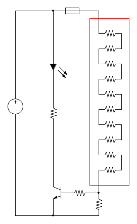 Detto questo, sempre che sia corretto, non capisco come calcolare la caduta di potenza totale; se non erro la serie di resistenze è, a sua volta, in serie con la risultante delle due resistenze(che sono in parallelo) collegate alla base del transistor mentre la resistenza del led è in parallelo a quanto detto adesso.