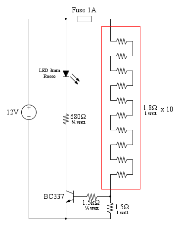 Se il fusibile salta oppure una qualche saldatura della serie di resistenze interrompe il collegamento allora il transistor interrompe il circuito del led che si spegne.