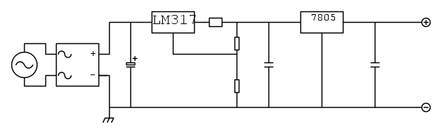 I due resistori del partitore determinano la tensione di uscita (a me servono per ridurre la Vin del 7805 e non avere una differenza eccessiva tra Vin e Vout del 317), mentre l'altro determina la corrente (come nella configurazione standard limitatore di corrente del 317). Configurazione "battery charger" trovata su un datasheet del lm317 e spudoratamente copiata (formule incluse che uploaderò).