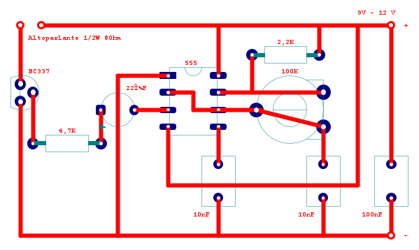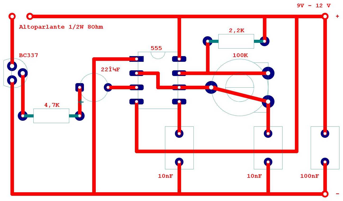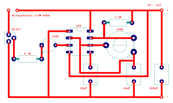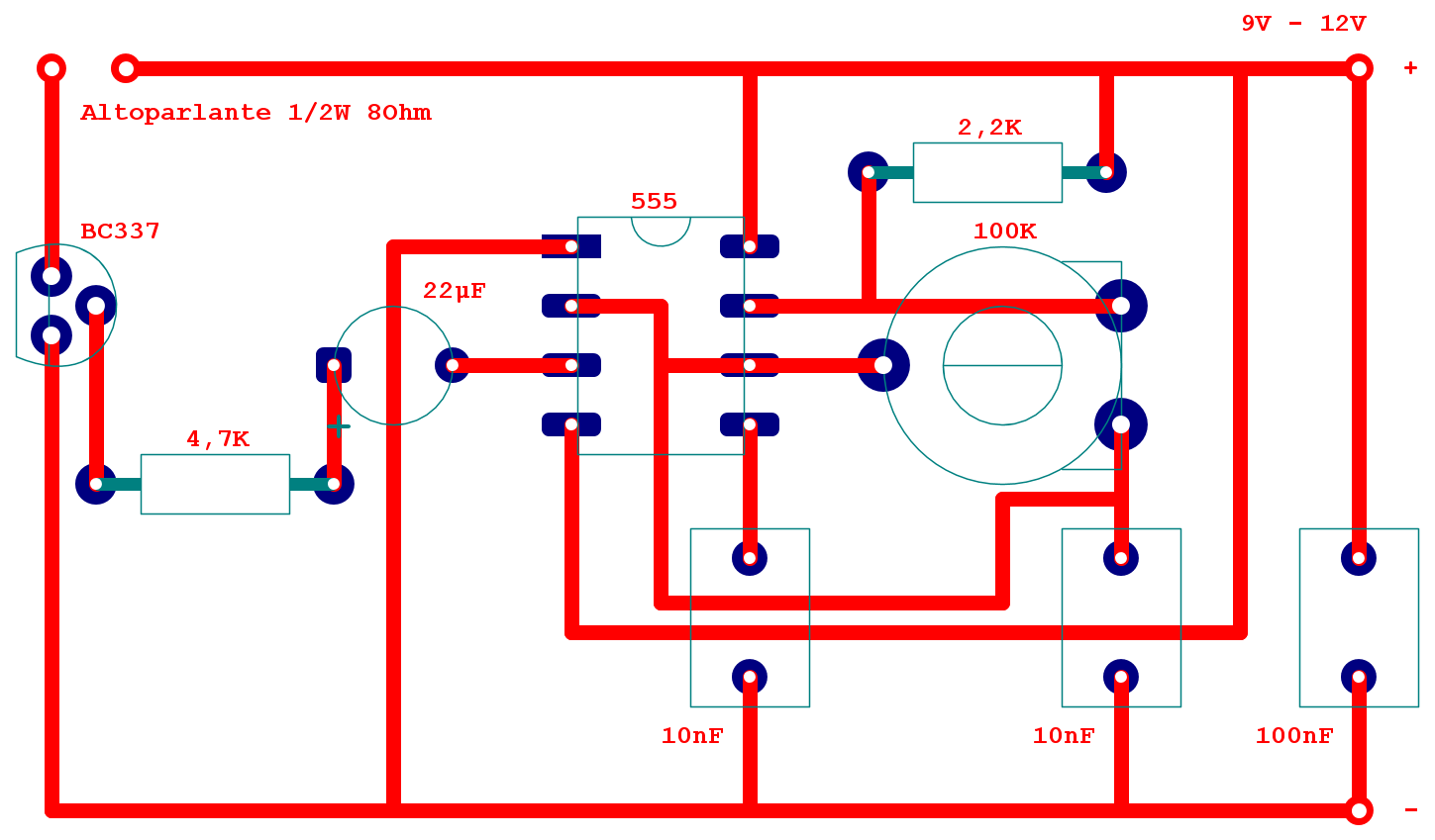L'altoparlante non può essere altro che collegato al BC337 come da schema, l'ho tagliato via solo per non appesantire l'immagine