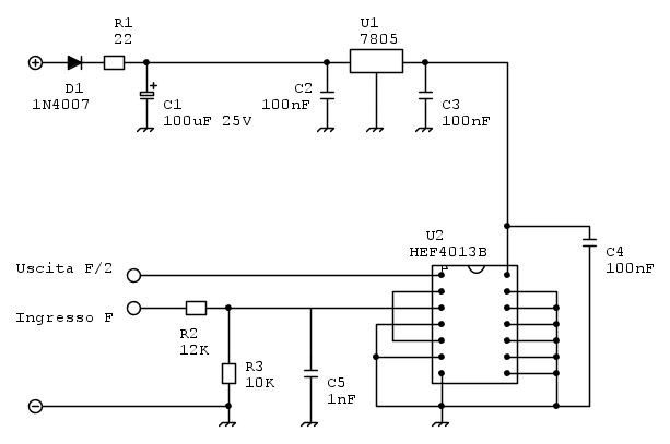 Per ora è solo preliminare, la parte di regolazione dell'alimentazione l'ho aggiunta perché non so se e quanto sia regolata la tensione presente sulla moto. Nel caso in cui sia buona e vuoi farne a meno l'integrato U2 può funzionare anche con quella, seppure vanno prese comunque precauzioni una delle quali è già stata inserita, D1. All'ingresso F ci colleghi il segnale dell'attuale contagiri e all'uscita F/2 dovresti vederlo diviso per due.