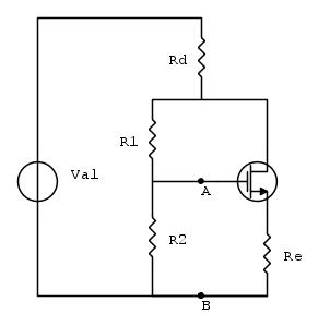 essendo la corrente di gate circa nulla, avevo considerato le resistenze di gate R1 ed R2 come se fossero in serie, dopo di che volevo applicare thevenin alla maglia a sinistra composta dal generatore, la Rd e la serie delle due resistenze R1+R2, solo che non capisco :