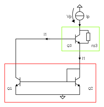 quello rosso e` uno specchio di corrente, non sara` ideale ma il suo onesto lavoro lo fa, e quindi le due correnti I1 sono praticamente uguali.