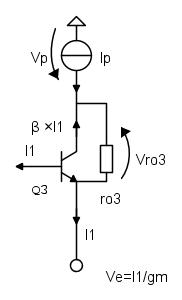 La tensione Vp vale allora V_p=r_{o3} (\beta+2)\frac{I_p}{2}+\frac{I_p}{g_m} e dato che il secondo addendo e` trascurabile e beta e` abbastanza grande, si ha V_p\approx r_{o3} \frac{\beta}{2}I_p e quindi la resistenza di uscita vale circa R_o=\frac{\beta \, r_{o3}}{2}