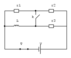 Calcolare l’energia immagazzinata nell’induttore in condizioni stazionarie con V =12 V, R1=20 Ohm, R2=40 ohm, R3=10 ohme L=4mH, quando (a) l’interruttore K è aperto e (b) quando l’interruttore è chiuso. Nell’ipotesi che l’interruttore K sia aperto da molto tempo, all’istante t=0 viene aperto l’interruttore T in modo da escludere il generatore. (c) Calcolare dopo quanto tempo la corrente che circola nei resistori si dimezza