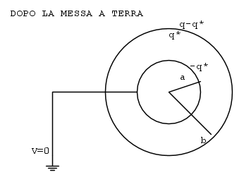 Con la messa a terra si porta invece a potenziale nullo. In questa situazione si ha un passaggio di elettroni sul conduttore interno e si deposita una carica -q* nel conduttore interno. per induzione la superficie interna del conduttore esterna si carica con carica q* e sull'armatura esterna avremo una carica q-q*.