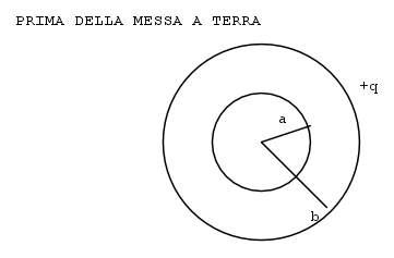 Prima della messa a terra la carica è presente solo sulla superficie esterna del conduttore di raggio b. Non c'è induzione. Vediamo l'adndamento del campo e del potenziale in questa situazione: