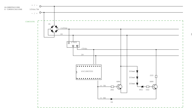 - L'alimentazione è di 12Vdc ma la polarità può essere invertita, questo per motivi meccanici. Quindi ogni circuito ad esso collegato disporrà di ponte diodi o altro sistema per la corretta alimentazione, alimentazione che verrà portata a 5Vdc da un regolatore di tensione.