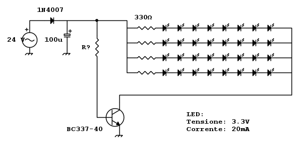Ho un trasformatore 220-24VAC e corrente massima di 62mA. Ho messo il diodo 1N4007 come semplice raddrizzatore e il condensatore elettrolitico da 100uF. Successivamente ho messo 4 resistenze da 330ohm, ricavato facendo: