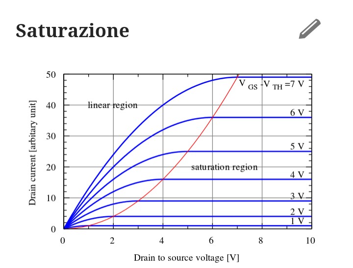 Dunque quando il transistor è acceso, sappiamo che tra Drain e Source scorre una determinata corrente I_D che assumerà valori diversi a seconda che il transistor sia in zona lineare o in saturazione. Questo è tutto ciò che possiamo dire.