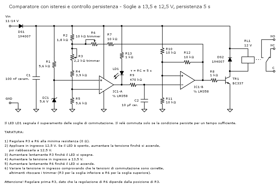 Perche' usate cosi` tanti potenziometri e trimmer (e rele')? Di solito meglio evitarli, per motivi di costo, affidabilita`, stabilita`... Se le specifiche sono sicure (ma non e` questo il caso, in cui la descrizione non e` molto chiara) si puo` fare un circuito comparatore preciso senza usare trimmer e zener, che anche loro come precisione lasciano a desiderare. Si tratta di usare un riferimento di tensione di precisione, e resistenze di precisione, oppure un A/D e un micro, ma non e` divertente