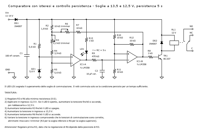Un esempio di come si puo` fare il comparatore con isteresi e` in questo schema