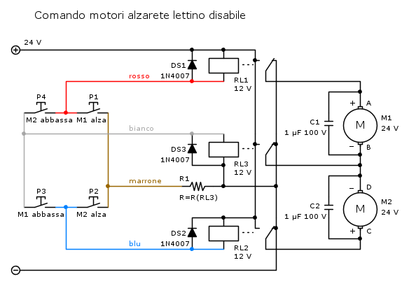 Sull'alimentazione di ciascun motore dovrebbero esserci per sicurezza anche dei finecorsa, probabilmente con diodi in parallelo. Non li ho disegnati per non complicare lo schema, comunque dovrebbero essere già presenti.
