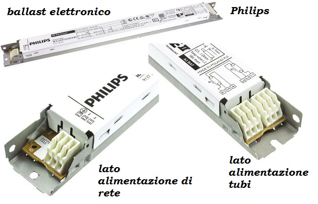 ed uno schema (attuale) che utilizza in lugo dei componenti precedenti, il cosidetto ballast elettronico, nel quale si trova serigrafato anche lo schema (semplice) di cablaggio del circuito, come nel caso di esempio del ballast philips...