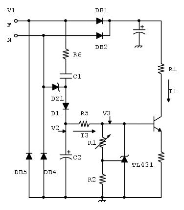 In questo modo quando il terminale di fase è positivo rispetto al neutro, C1 si carica attraverso R6, D1 e tutta la circuiteria inerente il TL431; la semionda positiva sarà clampata dallo zener DZ1 e V2 dovrebbe valere la tensione dello zener scelto. Il ripple a 50Hz viene ovviamente livellato da C2.