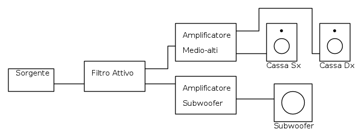 Se il subwoofer ha il suo amplificatore, bisogna usare un filtro attivo all'ingresso dell'amplificatore.
