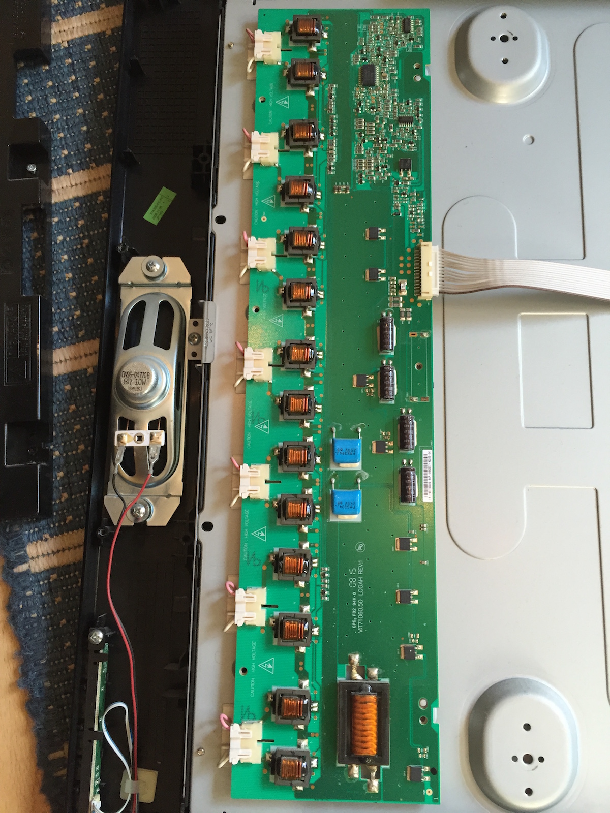 Il mio TV Samsung LE37A336 del 2008/2009 ha da qualche giorno cominciato a "scambiare" i colori sullo schermo in modo un po strano. Forse più che scambiarli ne elimina proprio alcuni, rendendo chiaramente inguardabile ogni programma. Per esempio il blu lo vedo rosso. Un piccolo ma credo importante particolare è che appena acceso non si manifesta subito il problema ma arriva crescendo dopo 10-20 secondi dall'accensione. In pratica sembra che un qualcosa si accenda bene per poi gradualmente andare a lavorare male. L'ho allora aperto ed ho notato che non è così pieno di circuiti e complicato come pensavo. Certo non è una radio ma pensavo di poter trovare qualche pezzo da sostituire.