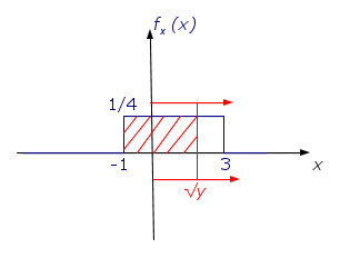 0<y < 9: \int_{(-\infty,\sqrt{y}]} f_X (x) \text{ d}x= \int_{-1}^0 f_X (x) \text{ d}x+\int_0^{\sqrt{y}} f_X (x) \text{ d}x=\frac{1}{4}+\sqrt{y}\cdot\frac{1}{4}=\frac{\sqrt{y}+1}{4}