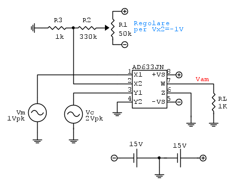Per ottenere un'uscita W che sia proporzionale a VAM, si collega X2 a -1V e X1 al segnale VM. Infatti, se X2 vale -1V, la differenza (X1-X2) diventa pari a (X1+1V); quindi usiamo l'ingresso X1 per il segnale modulante VM e abbiamo così ottenuto X=(VM+1V).
