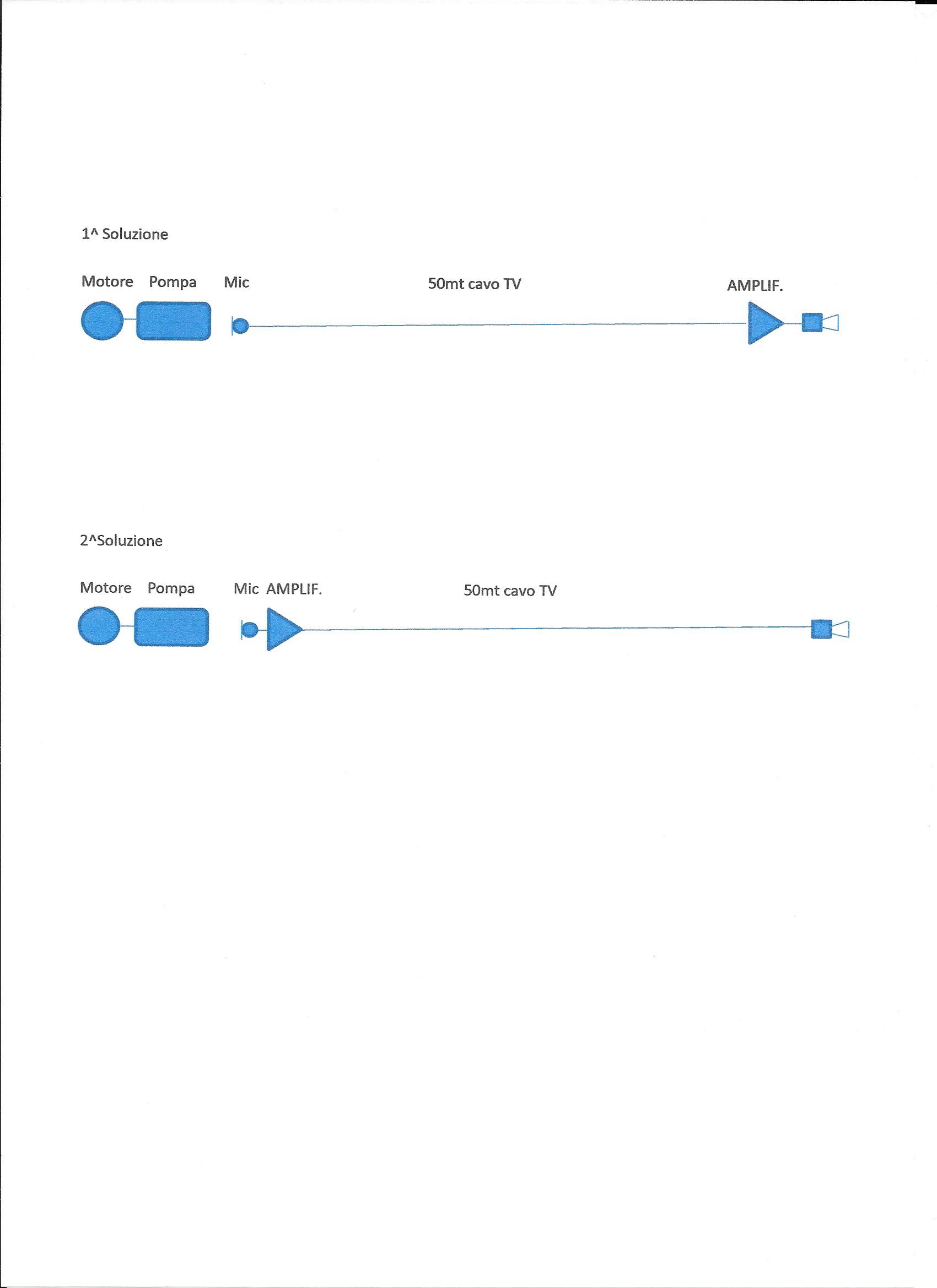 Ma non so se sia più conveniente mettere una piccola capsula microfonica preamplificata vicino alla pompa e l'amplificatore in studio con un altoparlante 4-8 ohm in uscita, oppure mettere la caplsula microfonica e amplificatore vicino alla pompa e l'altoparlante 4-8 ohm in studio. Per il trasporto del segnale lungo i 50 mt, ho pensato di utilizzare un cavo coassiale per TV che ho in deposito da qualche anno.
