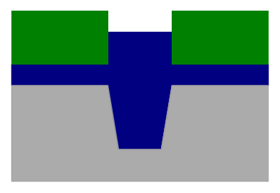 La parte centrale è una STI ed è stata deposta con tecnica SOD. La parte blu più sottile è il Pad Oxide, fatto crescere all'inizio del processo.